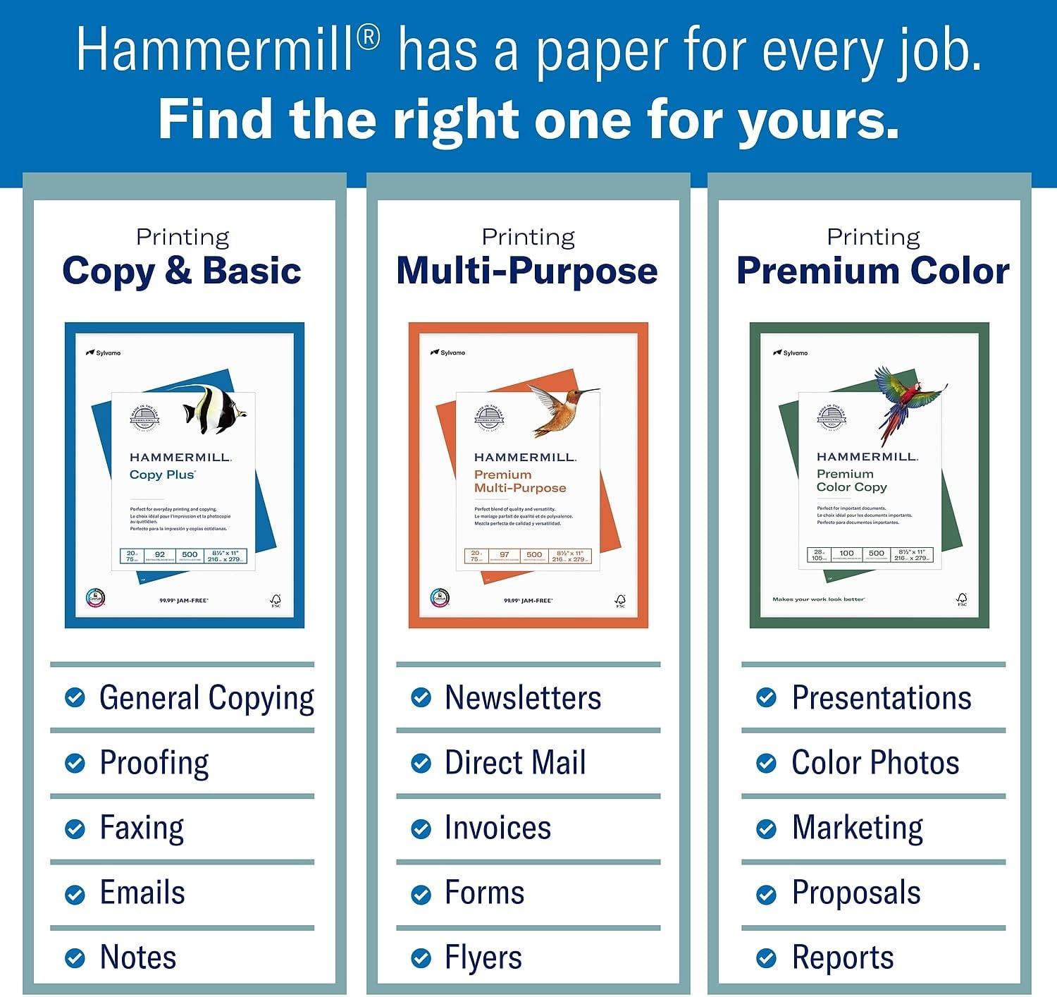 OTHER PAPER OPTIONS – Scroll down to compare Hammermill print and copy paper for every purpose including PREMIUM presentation-quality color copy paper, cover-weight paper stock, glossy paper for photo printing, and 15 pastel shades of multipurpose copy paper.