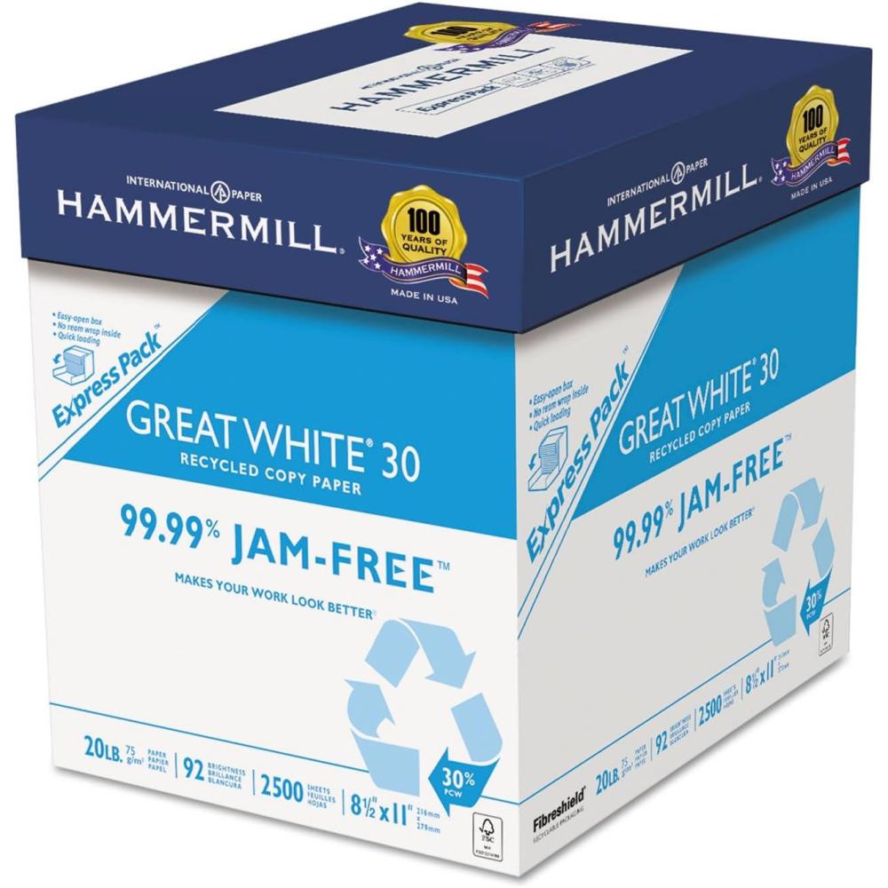 30% RECYCLED PAPER – Hammermill Great White recycled printer paper is made from post-consumer fiber. It is versatile paper with precise, accurate sheeting, consistent moisture content and curl control to ensure smooth, trouble-free performance.